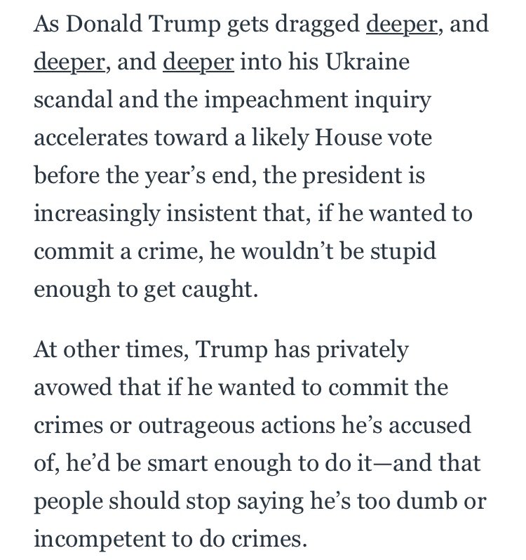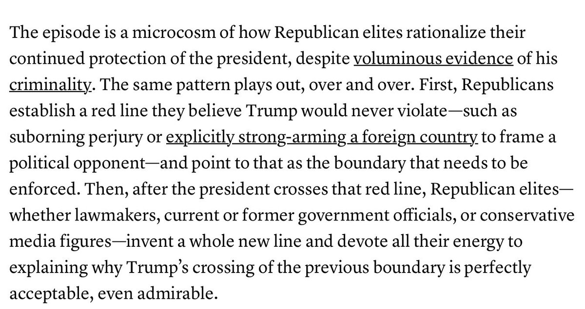 How Trumpian infallibility works: Republicans set a line they believe Trump would never be so stupid or corrupt as to cross. Then he crosses it, and suddenly it becomes the exact right thing to have done. https://www.theatlantic.com/ideas/archive/2019/11/republicans-believe-trump-infallible/601426/ …pic.twitter.com/36CWDhwE39