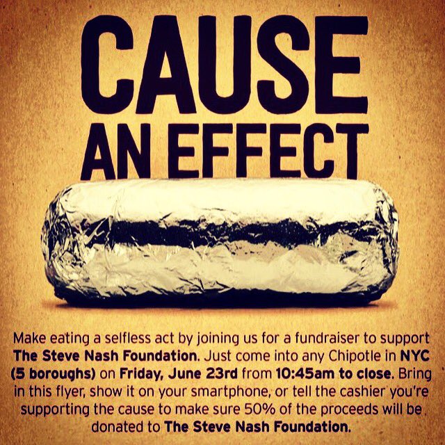 #NYC - today's the day! Order at any#Chipotle, mention theSteveNashFoundation, and@ChipotleTweets will donate to help kids!pic.twitter.com/AG5se18bwf