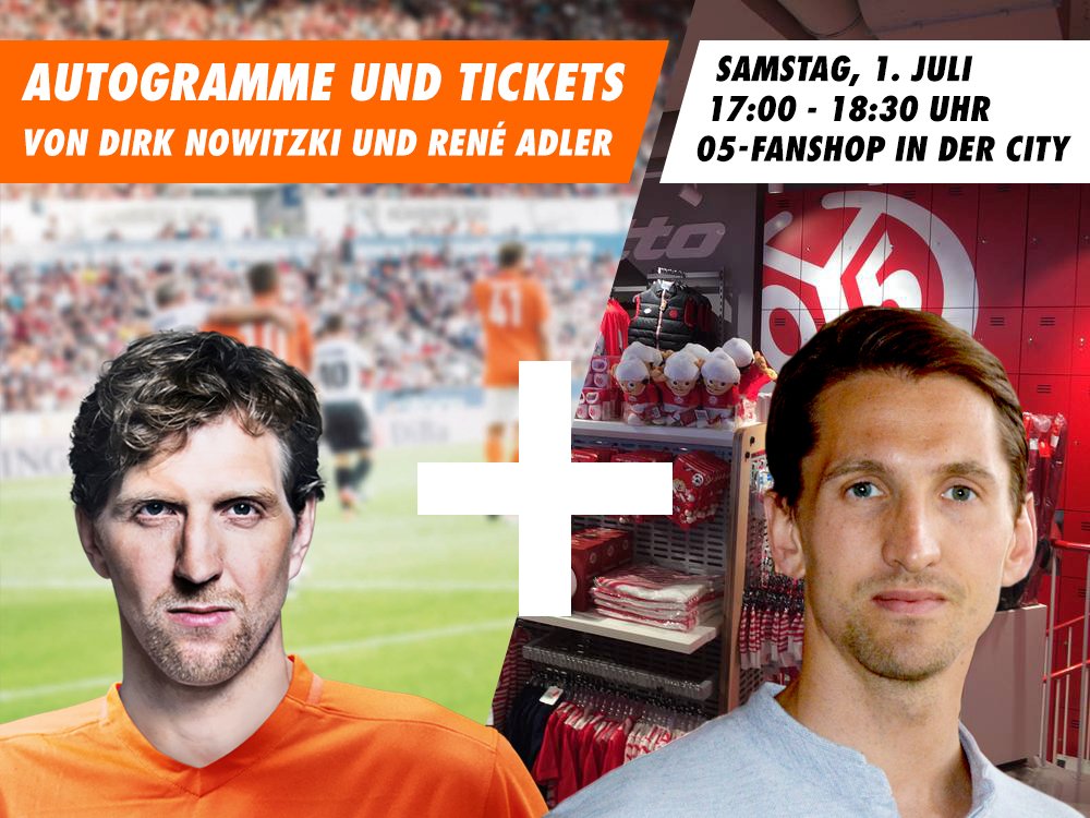 #Nowitzki und René Adler verkaufen am Samstag von 17:00 bis 18:30 Uhr im 05-Fanshop in der City Tickets für@Benefizkickpic.twitter.com/NvB35LQtT9