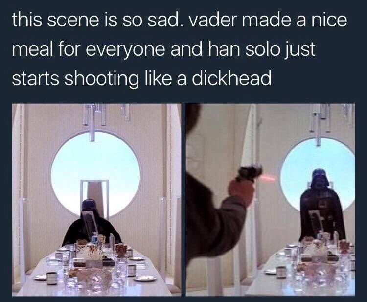 Palpatine arriving on Mustafar *sniff* Man something smells nice. That's a roast or something, hey Vader you cooking- oh... oh...