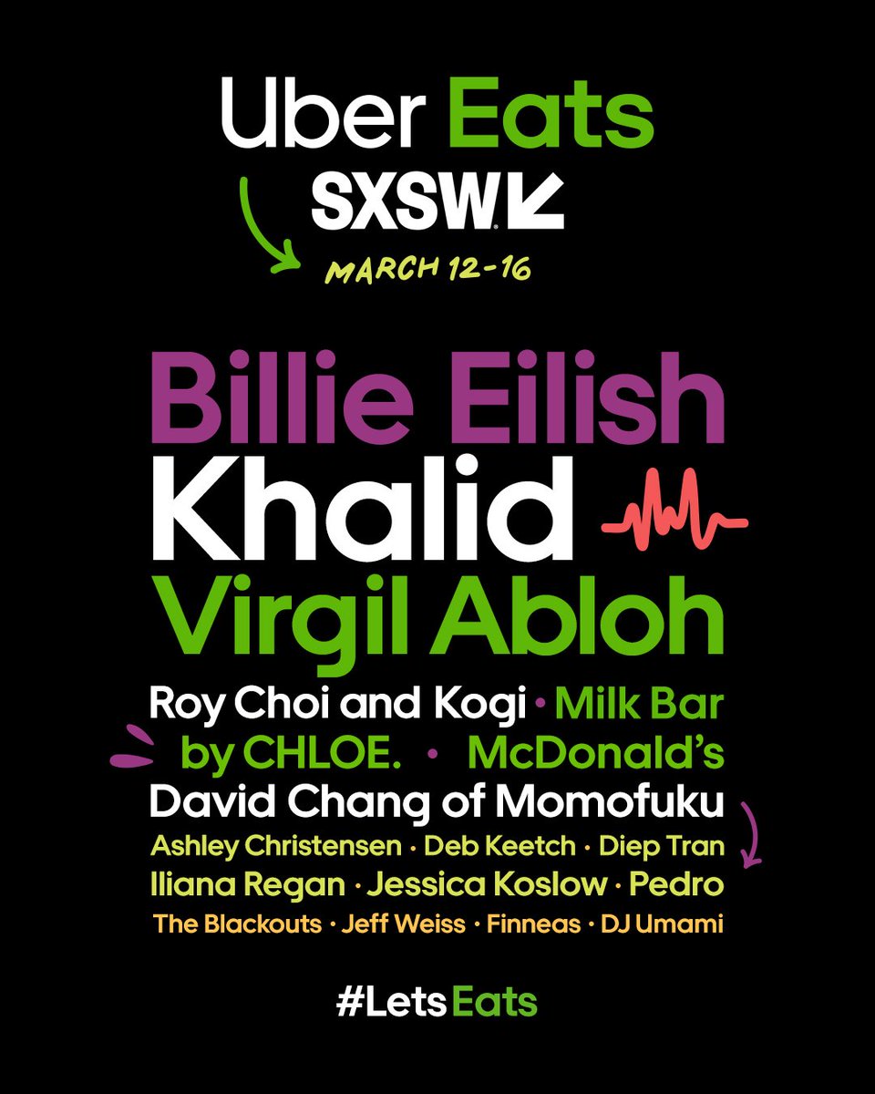 Usually, we come to your place. Next week, you’re invited to ours at #SXSW! Guests include @billieeilish, @thegreatkhalid, @virgilabloh, @RidingShotgunLA, @davidchang + many more! #LetsEats pic.twitter.com/6iKN8xHjxw