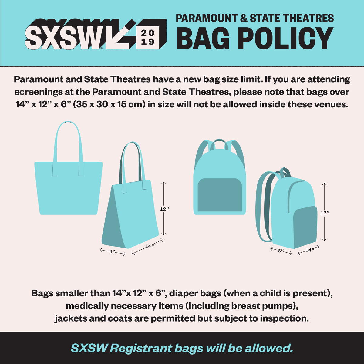 If you are attending #SXSW Film Festival screenings, please note that the @ParamountAustin and the Stateside Theatre have a new bag size limit. SXSW Registrant bags will be allowed.pic.twitter.com/nyPPZ0WdQj