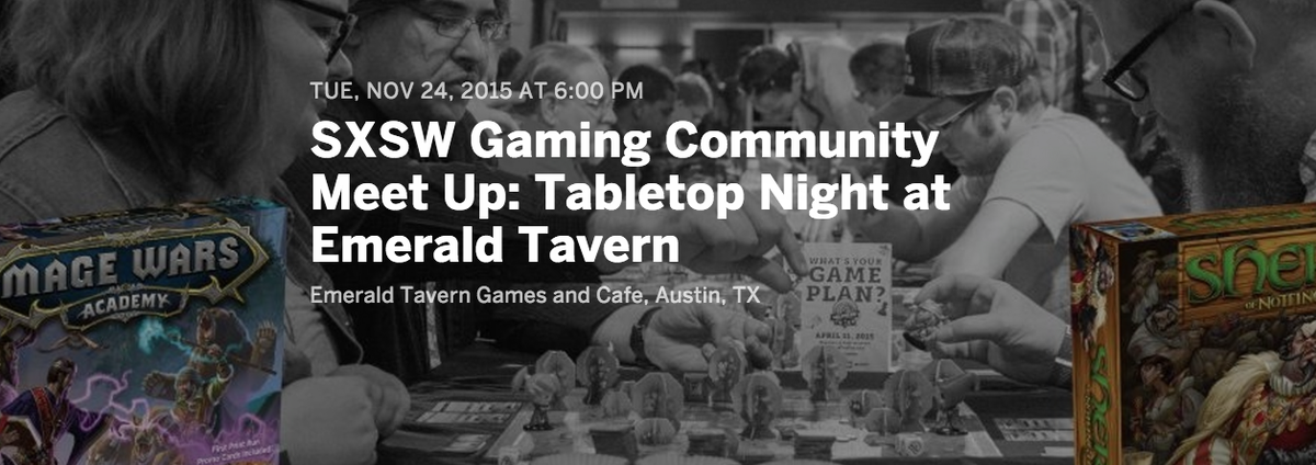 Tonight! Tabletop Tuesday at Emerald Tavern (we like the sound of that). Join us, FREE RSVP: http://sxsw.is/1l9QcSB pic.twitter.com/ROkZZcmu79