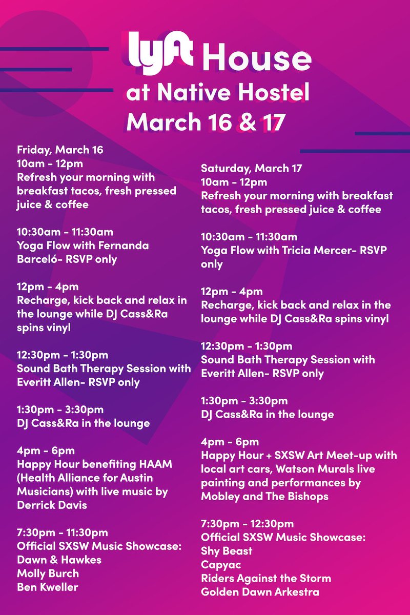 #LyftHouse starts tomorrow! Recharge your #SXSW 2018 with yoga, sound healing, nap pods, and music by Derrick Davis, @DawnandHawkes,@mollyjburch and @benkweller. RSVP here: http://ow.ly/Bcek30iXifY pic.twitter.com/No9Lcdeixb