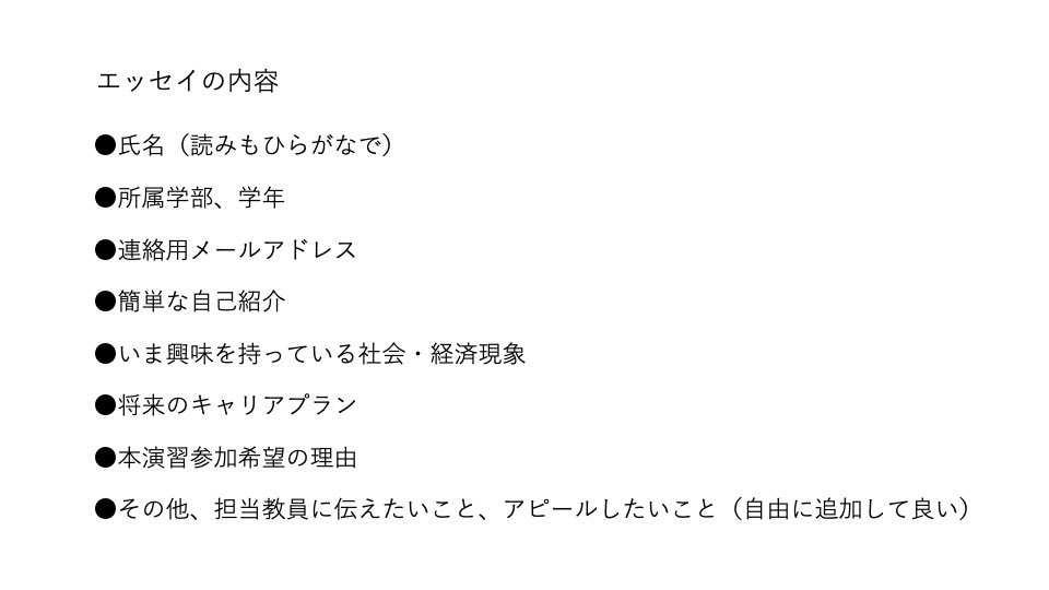 【ゼミ選考について】 ・一次募集(〜4/11 午前11時) ITC-LMS上で参加申込書、先生にメールでエッセイを提出してください。 ・一次募集結果発表 4/15 15時頃にITC-LMS上で合格者が発表されるのでご確認ください。 エッセイの内容は以下の通りです。pic.twitter.com/oWNauhzCWM