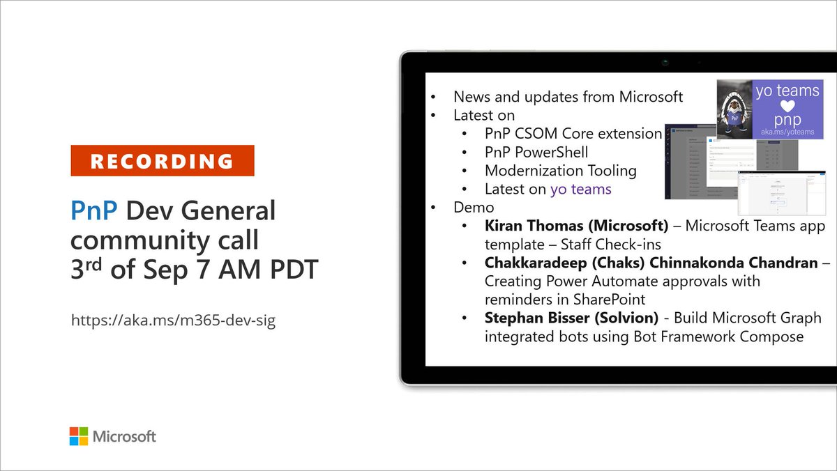 #Microsoft365dev &#SharePoint bi-weekly community call 3rd of September. Updates on the open-source projects and demos by@NotKiran,@chakkaradeep and@stephanbisser on#MicrosoftTeams app templates, bots and#PowerAutomate approvals https://developer.microsoft.com/en-us/microsoft-365/blogs/microsoft-365-pnp-general-developer-sig-recording-3rd-of-september-2020 …pic.twitter.com/8OV4Lzt6ob