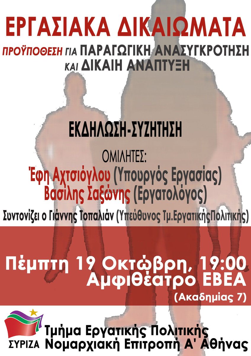 Εκδήλωση - συζήτηση για τα εργασιακά με ομιλητές την Έφη Αχτσιόγλου και το Βασίλη Σαξώνη σήμερα στις 19.00 http://bit.ly/2kZm7uf pic.twitter.com/18cJW8vP4Z