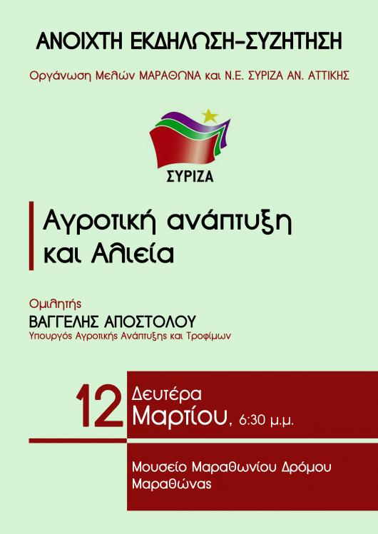 Η Ο.Μ. Μαραθώνα και ο ΣΥΡΙΖΑ Ανατολικής Αττικής διοργανώνει ανοιχτή εκδήλωση αύριο στις 18:30 στο Μουσείο Μαραθωνίου Δρόμου στον Μαραθώνα με θέμα «Αγροτική ανάπτυξη και Αλιεία»με ομιλητή τον υπουργό Αγροτικής Ανάπτυξης και Τροφίμων, Βαγγέλη Αποστόλου http://bit.ly/2FyR7XU pic.twitter.com/TB83D3NWoW
