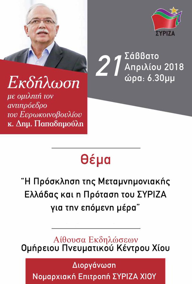 Ο @papadimoulis θα μιλήσει στην εκδήλωση που διοργανώνει η ΝΕ ΣΥΡΙΖΑ Χίου, με θέμα «Η πρόσκληση της Μεταμνημονιακής Ελλάδας και η πρόταση του ΣΥΡΙΖΑ για την επόμενη μέρα». Η εκδήλωση θα λάβει χώρα στο Ομήρειο Πνευματικό Κέντρο στις 18.30. https://bit.ly/2HixJiJ pic.twitter.com/OOagJU5qKb