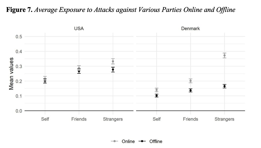 Do you have data on this? @M_B_Petersen and I collected self-reported survey data abt pol hostility against self/friends/strangers offline and online. We found largest asymmetries in witnessing attacks against strangers. 1/2pic.twitter.com/RKoiAm5bCf