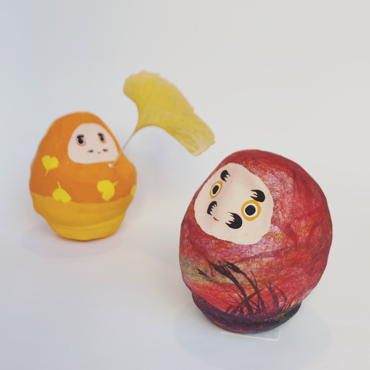みなさまコンニチワ。 矢嶋美夏個展【だるま歳時記】は13日(月・祝)まで。3連休もカラフルなだるま達がお待ちしています。 ◎「秋の暮」「秋思(しゅうし)」 色和紙と墨絵で夕暮れの情景を描いた「秋の暮」、ステキです。 「秋思」は好きな葉っぱが挿せるので、取り替えて楽しめます。pic.twitter.com/QqYWpp9wMq