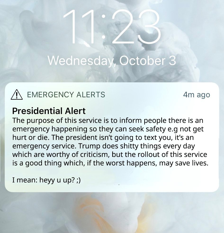 Wow, can't believe the President himself sent me a text using this emergency service what the heck??? #PresidentialAlert #PresidentialAlertSystempic.twitter.com/5gVsyvRioM