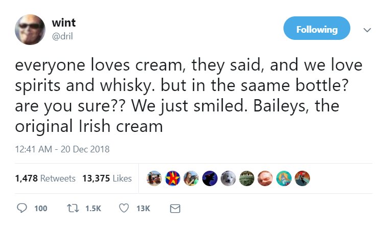 The Bailey’s Irish Cream origin story is just straight up a @dril tweetpic.twitter.com/l9gXej6hsq