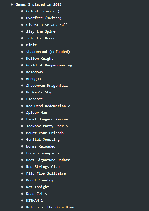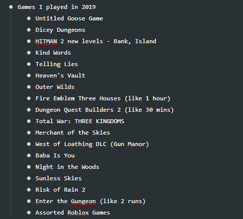 This is my actual list so far, I'm probably missing a couple but honestly no more than that. My spare gaming time has plummeted of recent, after work + cooking + chores I usually just want to veg out and binge watch something passive and comfortable on YouTube or Netflixpic.twitter.com/Z5YSPY3FLe