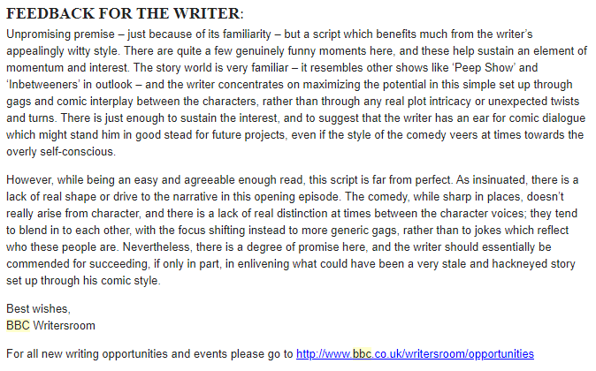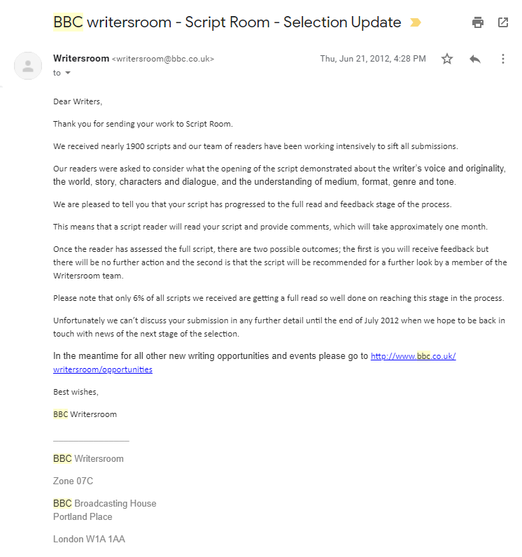 When I was 17 I submitted a spec script for a TV show pilot to BBC writer's room and made it to the shortlist, where a script reader politely informed me that my script was witty, but basically trash. Just found the actual emails lol - the feedback was actually really helpfulpic.twitter.com/SXMSKKpjKG