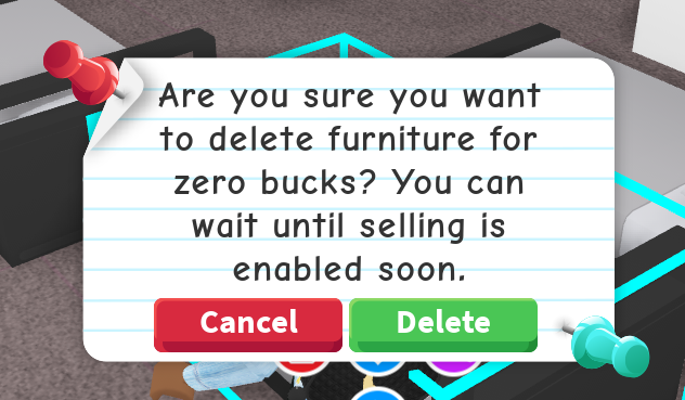 Selling items was/is temporarily disabled due to a bug. We still allowed players to delete items if they really needed to remove them from homes. There were 3 on-screen warnings you had to agree to click 'Delete' twice to delete an item, including a "zero bucks" warningpic.twitter.com/wo42tvuwmj