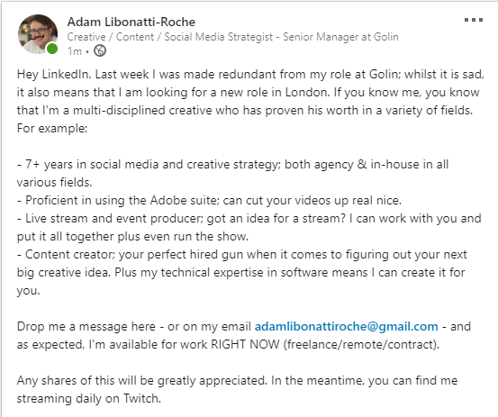 ICYMI: I'm looking for work. Shares of this would be super appreciated. https://www.linkedin.com/feed/update/urn:li:activity:6663763222568423424/ …pic.twitter.com/cdTamFUfMX