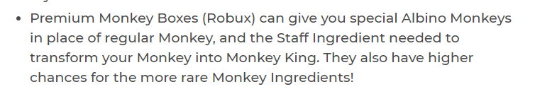 So theres some kinda confusing/misleading info in the adopt me vlog so i wanted to clear it up! The Albino Monkey is a CHANCE! I feel like "chance" should have been listed as opposed to "can get" here, so be aware that the robux box is only a 5% Chance for LEGENDARY!!pic.twitter.com/0gZWsHsqLJ