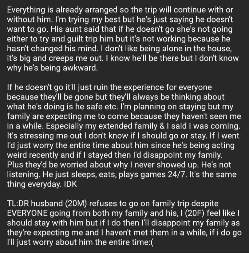I (20F) Don't Know How To React To Husband (20M) Refusing To Go On Family Holidaypic.twitter.com/O5gGz4Cerg