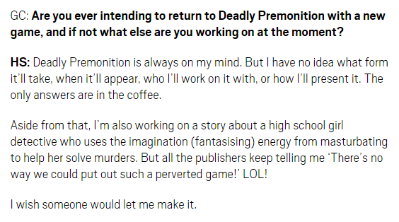 The creator of Deadly Premonition is making a game where a schoolgirl solves crimes by masturbating (via @MetroUK)pic.twitter.com/x1GJAqcAIu