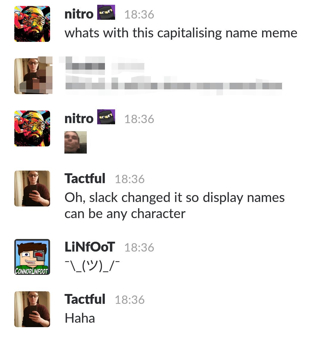 Slack added capitalisation to display names. I love our team @ConnorLinfootpic.twitter.com/qsnQSJ9PAY