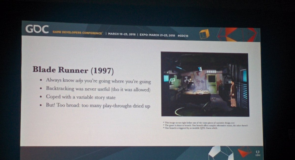 Ingold cites The Last Express and Blade Runner adventure games as (severely flawed) masterpieces that manage a lot of complex world state for effective plotting #GDC18pic.twitter.com/NHUJDOrDhv
