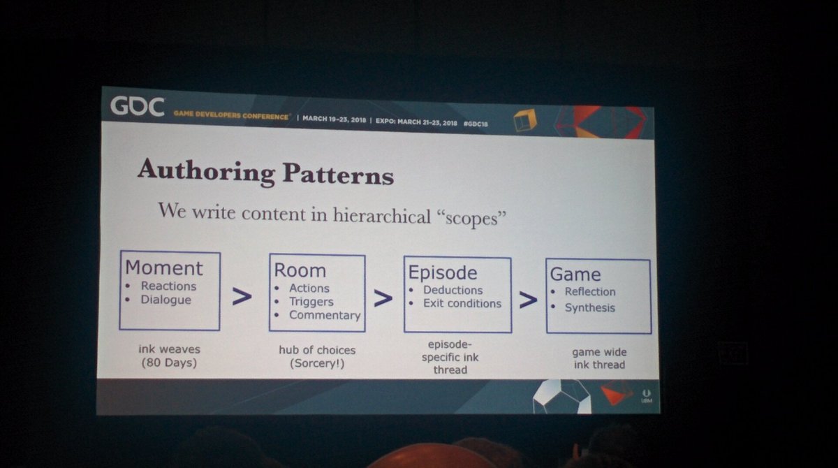 ok now here's the meat for narrative designers: Ingold argues for an "atomic" model of systemic game narrative, where all story beats are "self-branching" based on world state, player's knowledge model, and time / relevance #GDC18pic.twitter.com/WFzCeFLh3D