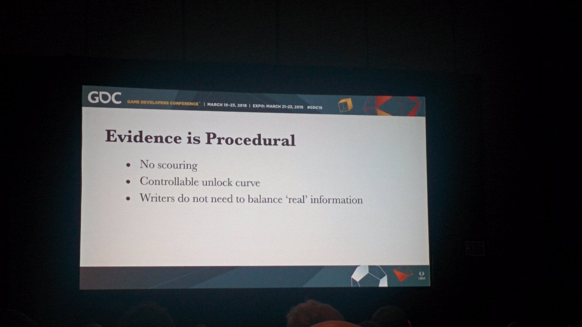 The engine procedurally generates your investigations / "evidence", can tune it easier or harder, can automatically avoid redundancy (e.g. instead of finding another clue about X, it will generate Y instead)... separation of game writing from game narrative (!) #gdc18pic.twitter.com/rOjs9mfw4T