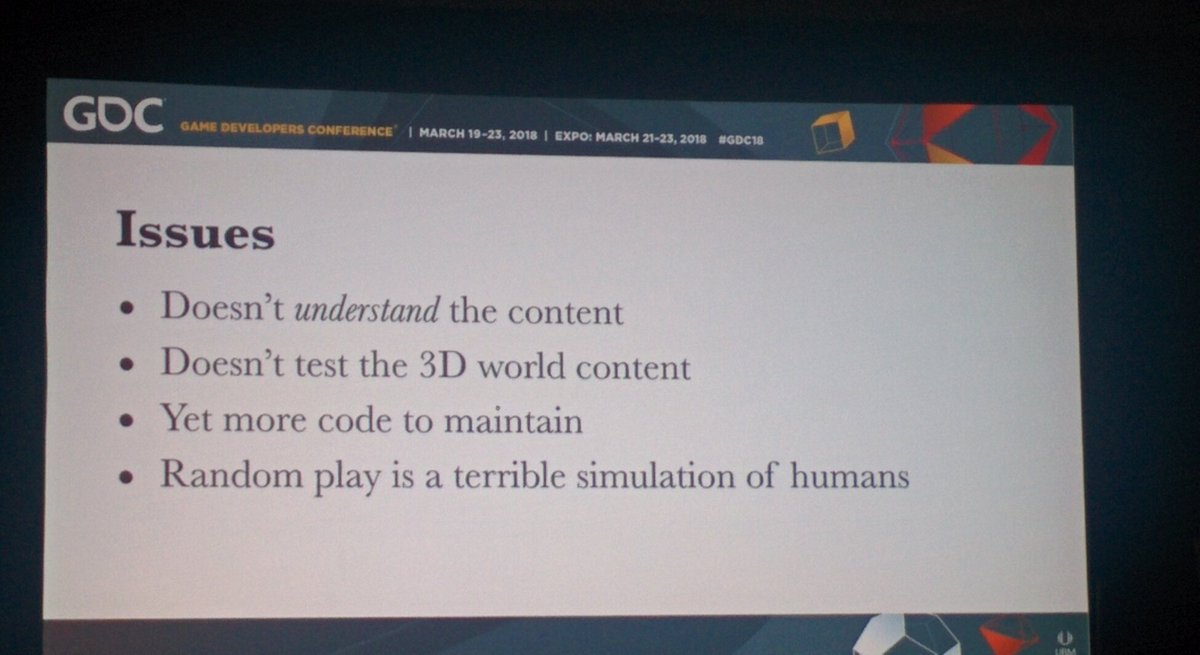 now the big problem with automated testing of massive story worlds: computers can't understand story or actual experience of playing a game, and also, the engineering overhead is really heavy now #GDC18pic.twitter.com/LbEORK4MD6