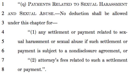 It's like all of November's top news stories merged into one: Here's the language on nondeductibility of payments related to confidential sexual harassment/abuse settlements in the Senate tax bill (introduced by @SenatorMenendez):pic.twitter.com/dpvtr3GIKK