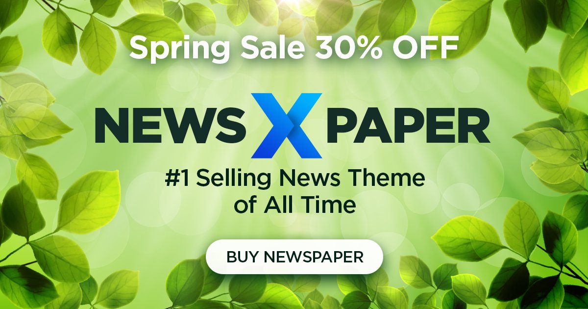 Inspired Spring Sale is Live: awesome 30% off for the #𝗡𝗲𝘄𝘀𝗽𝗮𝗽𝗲𝗿 𝗪𝗼𝗿𝗱𝗣𝗿𝗲𝘀𝘀 𝗧𝗵𝗲𝗺𝗲. Grab your Discount and build a good-looking, fast, and fully-functional WordPress website
