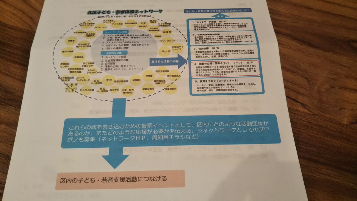 今年5月に発足した「北区子ども・若者応援ネットワーク」会議に参加。区内の子ども・若者支援をしている団体、企業、学生、区民などが連携し「育つ力を支える社会を目指して」活動を進めています。会合もわくわく感あり