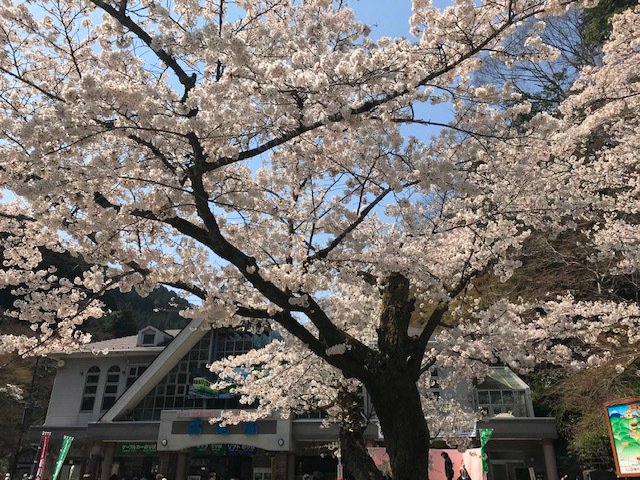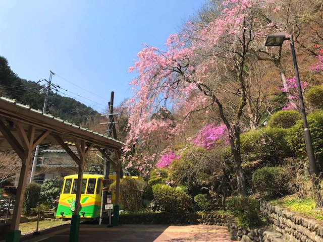 花だより ケーブルカー清滝駅ホームの枝垂桜とミツバツツジが見ごろとなっており、駅前広場のソメイヨシノは満開。少しずつ散り始めております。