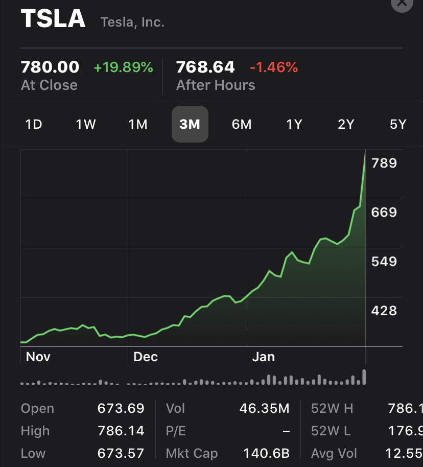 11月末の米国株式セミナーで、私が「GAFAに続く企業はTesla」と発言した時の株価は$320でした。それがわずか2ヶ月で$780に。あまりにも早いペースは予想外。