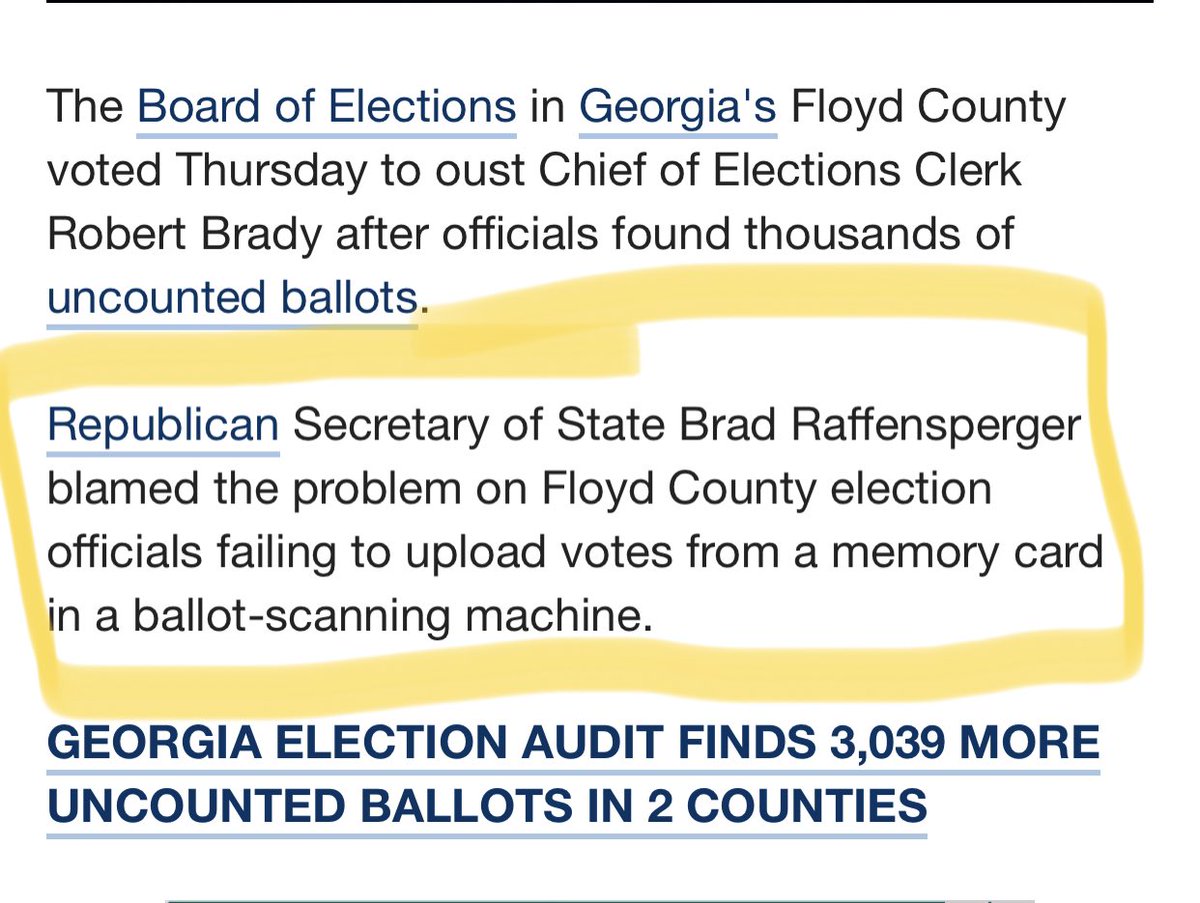 @GaSecofState blamed Floyd County’s uncounted ballots on a memory card. However my video linked below has the Floyd County Election Board admitting it wasn’t a memory card issue.@RealAmVoice https://twitter.com/talkmullins/status/1328857648276574210?s=21 … https://www.foxnews.com/politics/georgias-floyd-county-fires-election-director-after-finding-uncounted-ballots …pic.twitter.com/oDFjZGiuvD