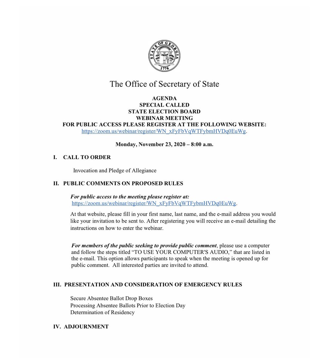 @GaSecofState office is having a Special Called State Election Board Meeting tomorrow to discuss the following matters: -Secure Absentee Ballot Drop Boxes -Processing Absentee Ballots Prior to Election Day -Determination of Residency@RealAmVoicepic.twitter.com/9nGupLzPgk