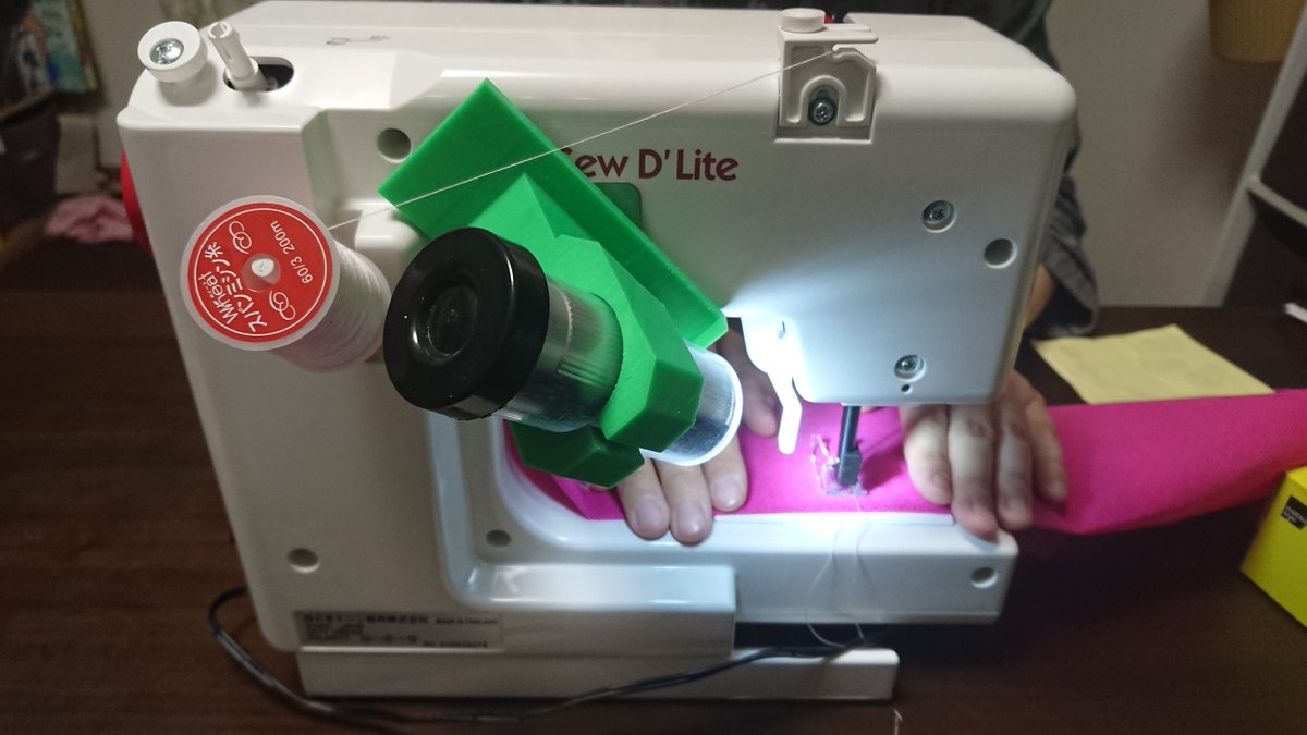 買ったミシンは手元ライトがないタイプだったので、旦那様が3Dプリンタでライトホルダー作ってくれた。すごい見やすい!!https://twitter.com/mt_field/status/1257318361546936326 …