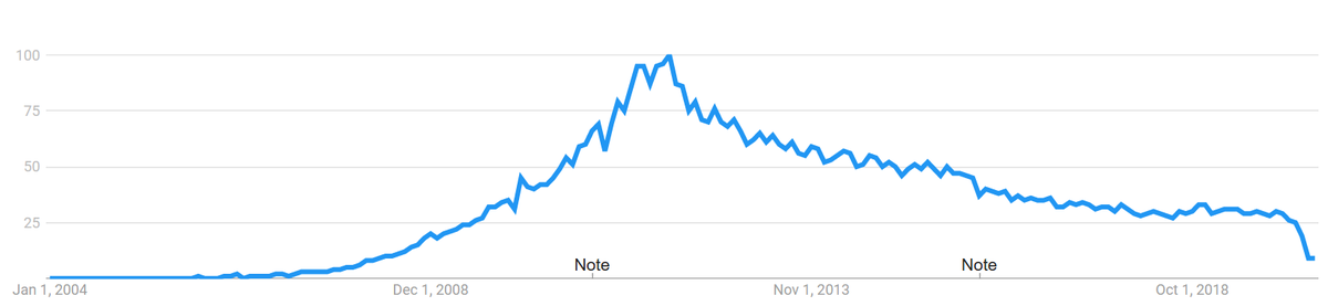 このTweetの謎グラフ(2016/11にピーク,最近まで堅調に推移、2020/3から急落,2020/5は低い),正答とは違うけど「食べログ(添付)」はだいぶいい線行ったと思う. https://twitter.com/cnxt_nozomu/status/1260430701079531524 … ※なお,元ツイは5/15のトレンドグラフなので正答を入れても今は形状が変わってますpic.twitter.com/jSJ4oI6yrB