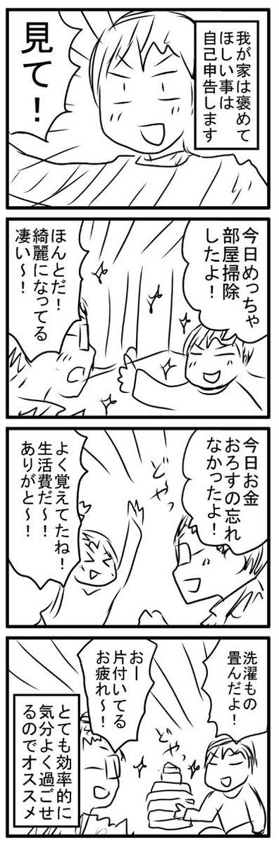 うちは大体こんな感じな気がする.なんかがんばったらドヤ顔!|“夫婦円満におすすめ「察してもらえると思うな」”https://twitter.com/renoreno0802/status/580921463533756416 …