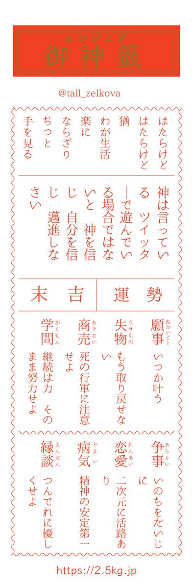 エンジニア御神籤を引いてみた #engmikuji https://2.5kg.jp pic.twitter.com/MNga2E8hpK
