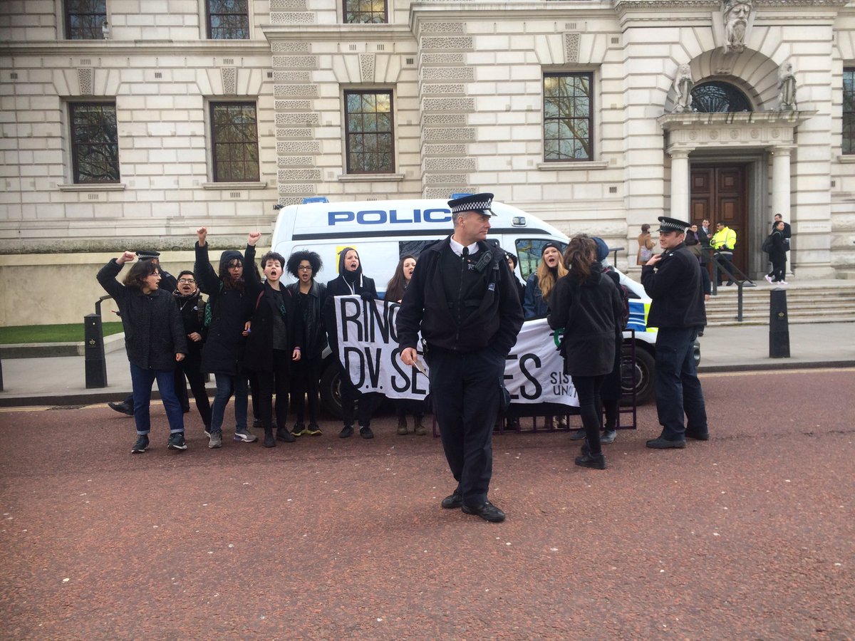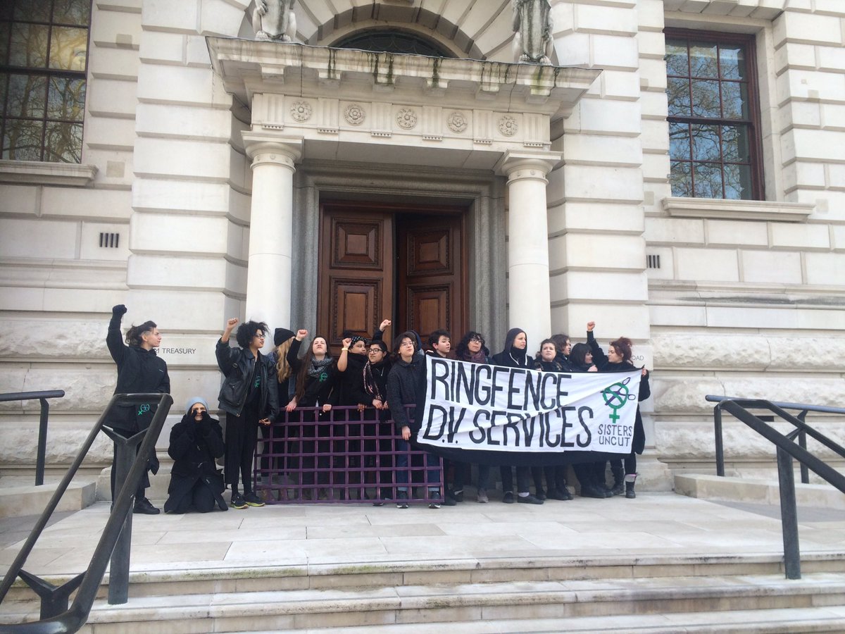 Treasury workers pushing past Sisters to get inside - just like Osbourne pushes women aside in his cuts