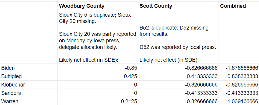 What we know about Sioux City What IDP is reporting for Sioux City 5 & 20 combined: Biden 8-Sanders 6-Buttigieg 4. What it *likely* is, per reporting from Mon. & Thur (see above): Sanders 6: Biden 4-Buttigieg 2-Warren 1 (So -0.84 SDE Biden, -0.42 SDE Pete, +0.21 SDE Warren.)