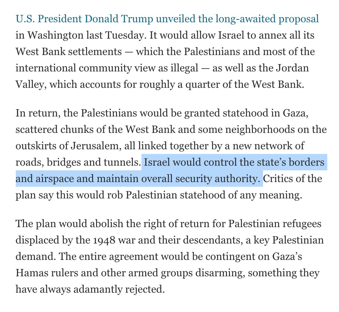 First they need to agree upon the definition of "state". I think the Palestinians would've agreed if they were likewise given control over Israel's "state borders [..] airspace [and] overall security" https://www.haaretz.com/israel-news/kushner-palestinians-must-meet-mideast-plan-s-conditions-to-be-granted-statehood-1.8479480 …pic.twitter.com/iz4gIn41IP