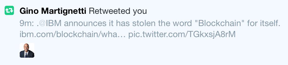 @ultimape @taoeffect My strategy is to be the first person to have a "Blockchain" emoji. #IBM