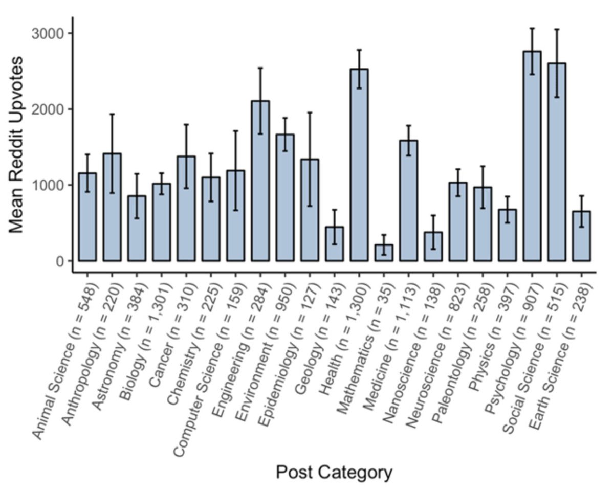 As measured by Reddit upvotes, the public are most interested in Psychology of the scientific disciplines, & within Psychology, they are most interested in Social Psych. Quality metrics (e.g., impact factor) are unrelated to upvotes. By
