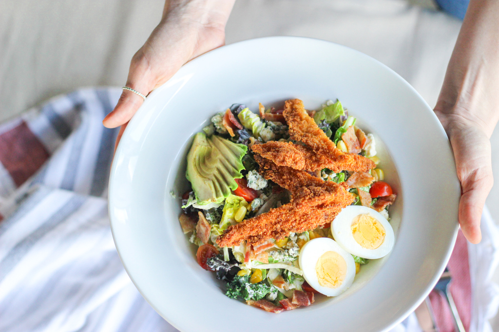 Tonight's recommendation? Crispy Chicken Cobb Salad paired with @brewhall Hall Pass IPA - perfect for the patio