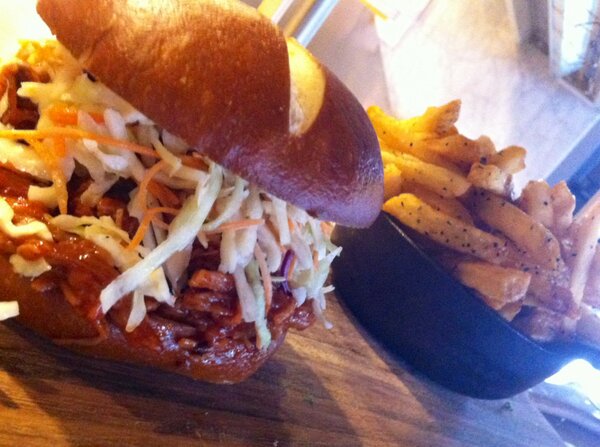 Lunch Feature: Pulled pork sandwich on a pretzel bun with coleslaw and a side of fries $10pic.twitter.com/v89fN96O