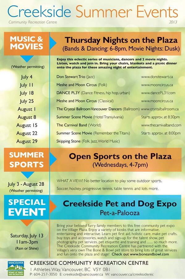 Our schedule of free outdoor events this summer #inthevillage plaza next to @creeksiderec & @tapandbarrel.pic.twitter.com/98ht4cLdxA