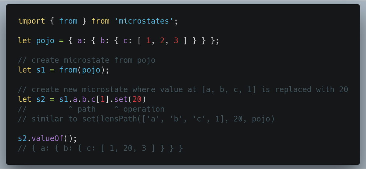Keen eye! We use lenses under the hood in Microstates and we provide telescopic lens API for use outside of microstates. It allows to use dot notation to focus on state and invoke transitions.pic.twitter.com/CUnxRoaRnW