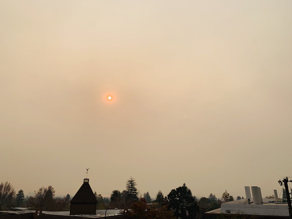 山火事 #CampFire の煙が流れ込んでいる今日のバークレー、天気「晴」でこの空の色。空気の質を表す #AQI は169で中程度の汚染。pic.twitter.com/sxqx5gwYLr